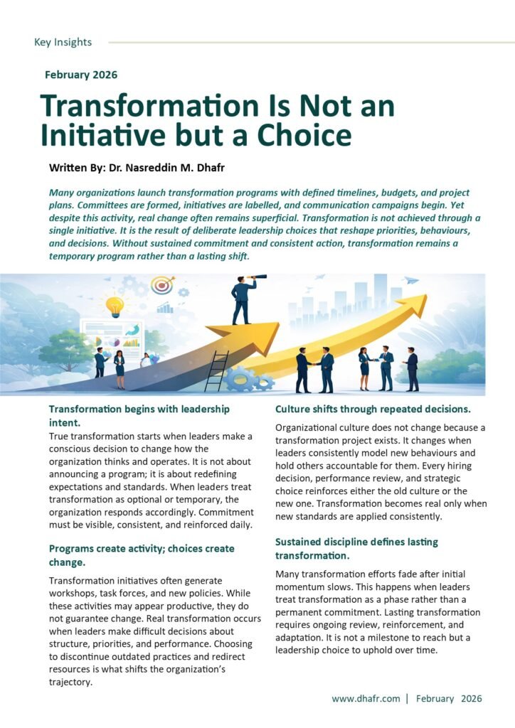 In parallel, Dr. Dhafr has designed and delivered extensive executive training and professional certification programs in strategic planning, strategy execution, KPI development, initiative management, OKRs, and organizational performance measurement. His approach is highly practical, focusing on governance, accountability, and execution rather than theory alone.