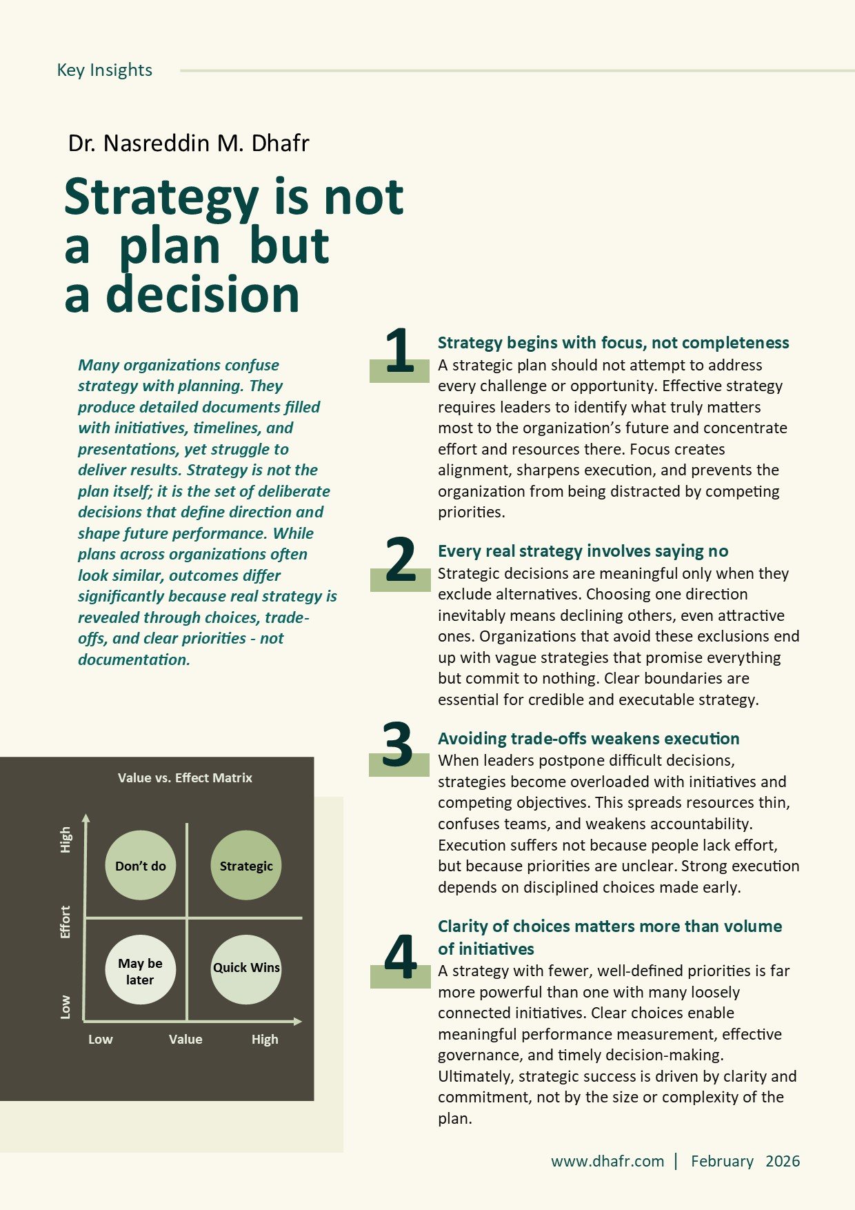 Plans may be similar between organizations, but the real difference appears in making the difficult decisions: What do we focus on? And what do we decide not to do? A good strategy is measured by the clarity of the choices, not by the number of initiatives.